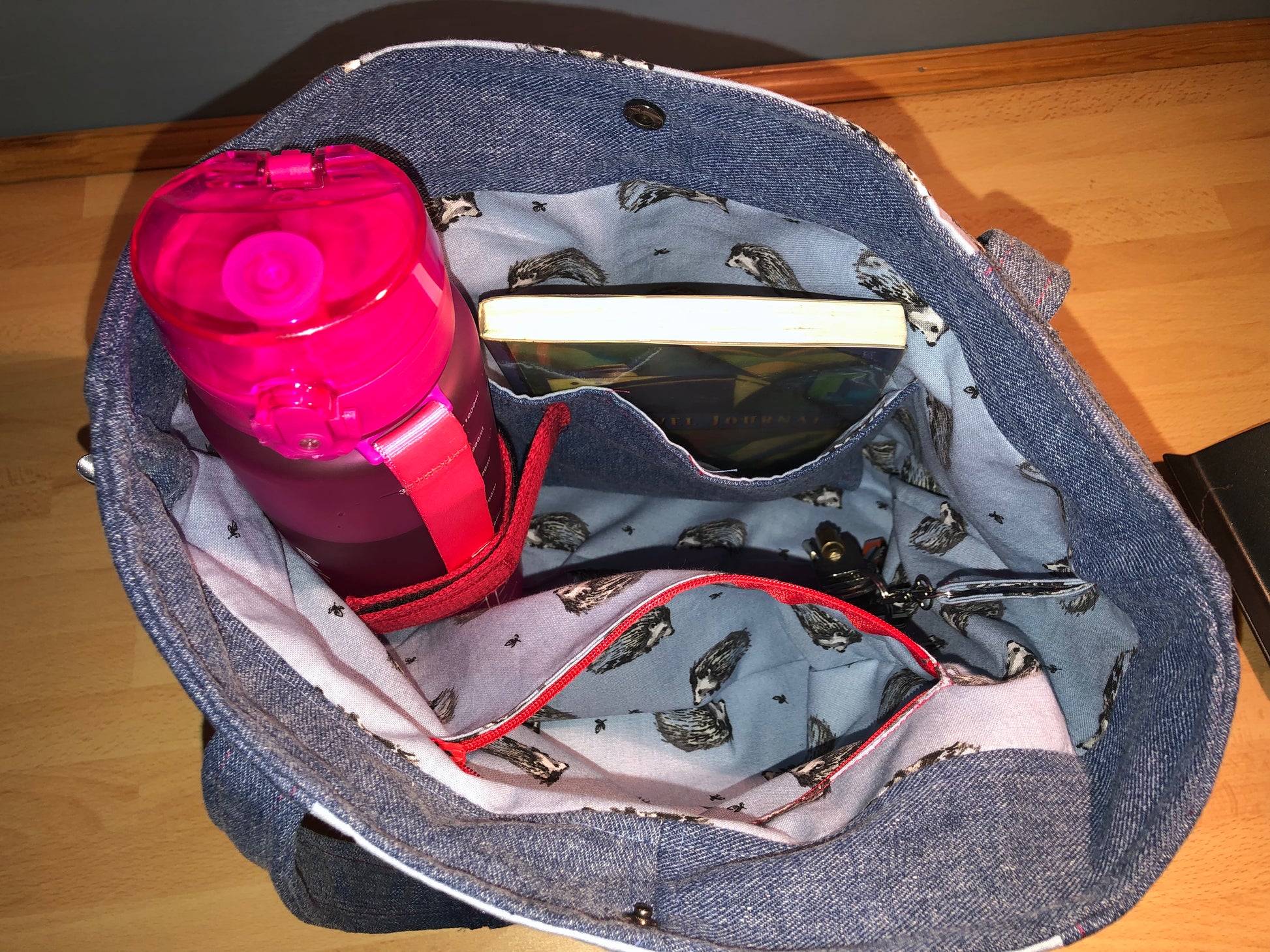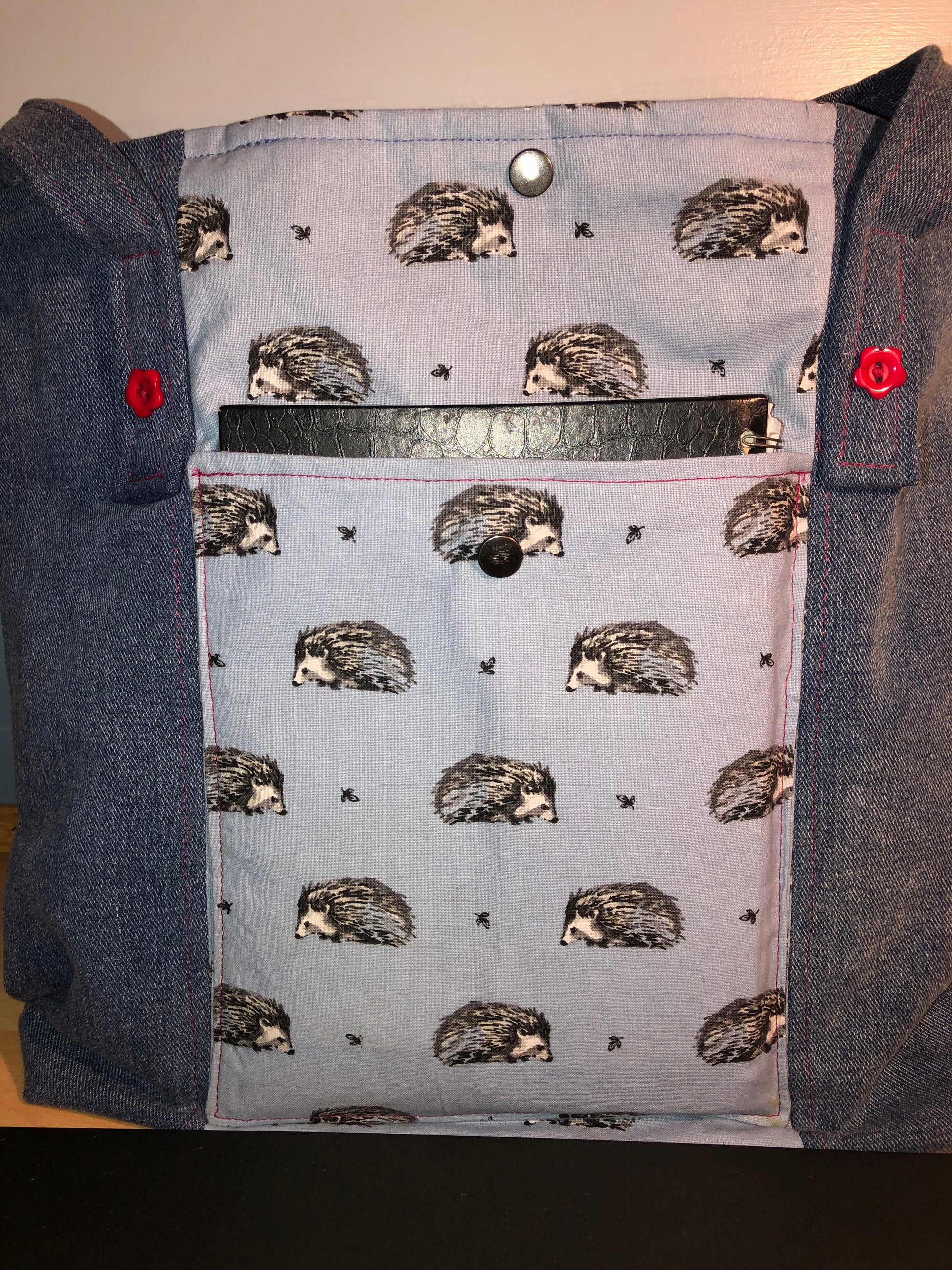 Hedgehog and denim shopper /work bag with water bottle holder and pockets